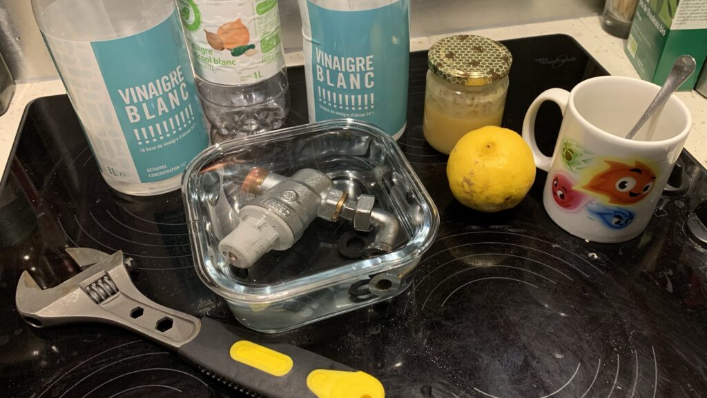 Actuellement, le réducteur baigne dans le vinaigre. Je n’ai toujours pas sommeil. Je ne sais même pas si je vais retrouver de la pression. Ma chérie va faire la tête en se levant dans quelques minutes et découvrir que la douche est hors service.